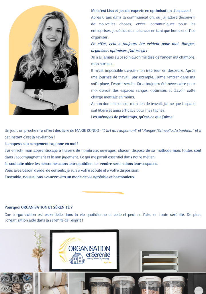 Moi c’est Lisa et je suis experte en optimisation d’espaces !Après 6 ans dans la communication, où j’ai adoré découvrir de nouvelles choses, créer, communiquer pour les entreprises, je décide de me lancer en tant que home et office organiser.En effet, cela a toujours été évident pour moi. Ranger, organiser, optimiser, j’adore ça !Je n’ai jamais eu besoin qu’on me dise de ranger ma chambre, mon bureau…Il m’est impossible d’avoir mon intérieur en désordre. Après une journée de travail, par exemple, j’aime rentrer dans ma safe place, l’esprit serein. Ça a toujours été nécessaire pour moi d’avoir des espaces rangés, optimisés et d’avoir cette charge mentale en moins.À mon domicile ou sur mon lieu de travail, j’aime que l’espace soit libéré et ainsi efficace pour mes tâches.Les ménages de printemps, qu’est-ce que j’aime !